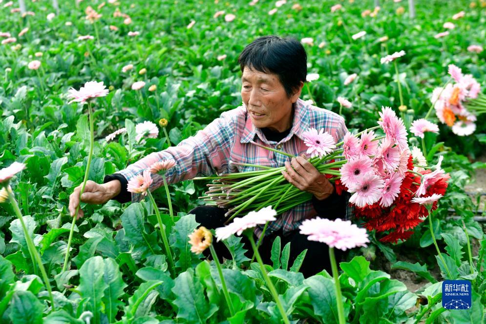 10月27日,在菏澤市定陶區百盛萬(wàn)?,F代農業(yè)產(chǎn)業(yè)園,花農在采摘非洲菊。