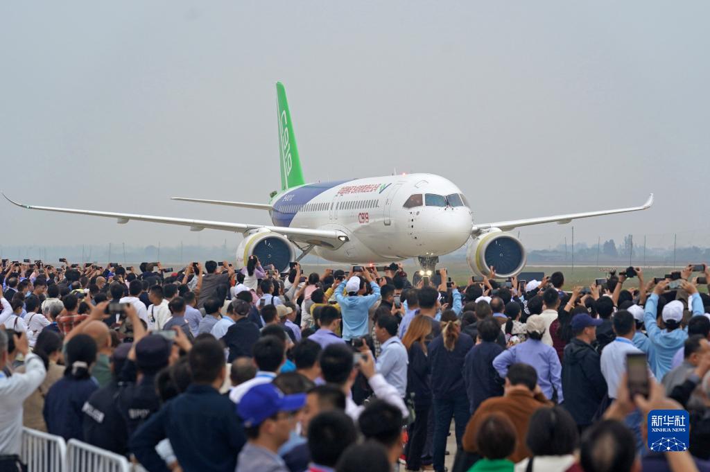中國商飛C919大型客機從觀(guān)眾面前駛過(guò)(10月27日攝)。