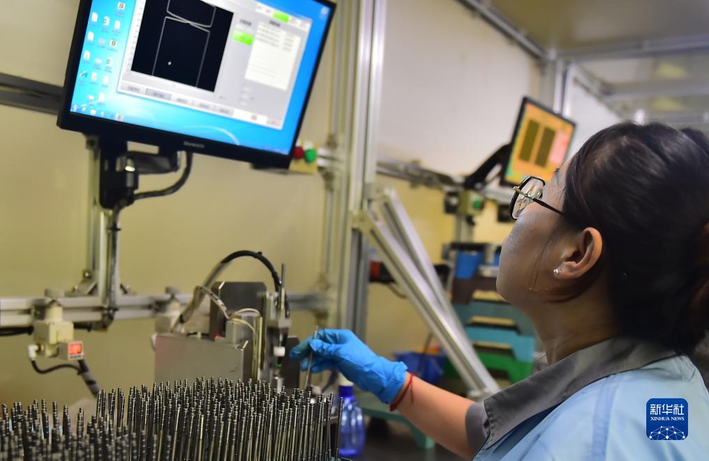 10月26日,在山東省聊城市高新區山東鑫亞格林鮑爾燃油系統有限公司生產(chǎn)車(chē)間,技術(shù)人員在生產(chǎn)線(xiàn)上檢驗產(chǎn)品。