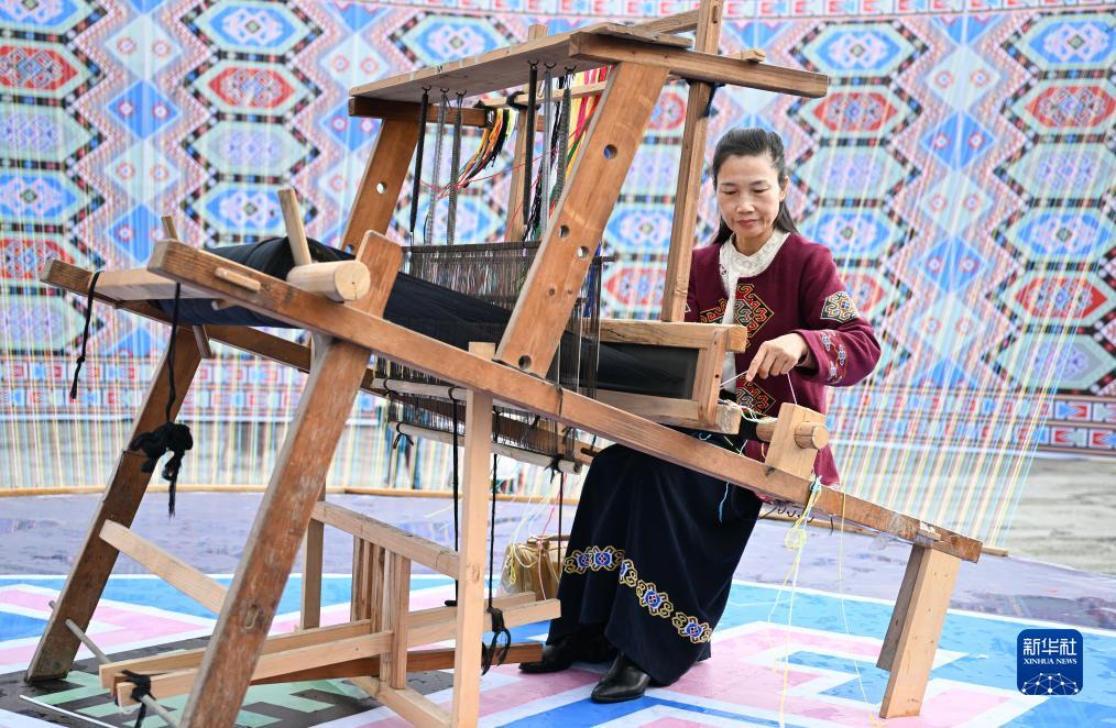 當日,數十名織錦女工在湖北省來(lái)鳳縣龍鳳文化中心廣場(chǎng)現場(chǎng)進(jìn)行“西蘭卡普”制作,普及非遺文化。