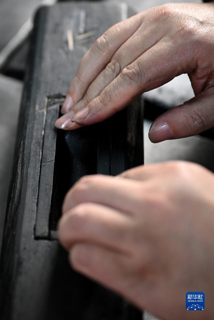 10月24日,在安徽省黃山市歙縣老胡開(kāi)文墨業(yè)有限公司,周健將揉搓好的墨條放入墨模。