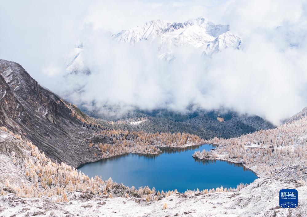 雪山、黨嶺村葫蘆海、彩林構成一幅優(yōu)美的畫(huà)卷(10月27日攝,無(wú)人機照片)。