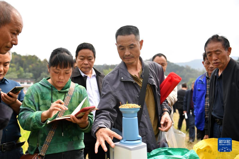 10月28日,在位于婁底市雙峰縣永豐街道松坪村的“稻再油”示范片,工作人員檢測再生季稻谷含水量。