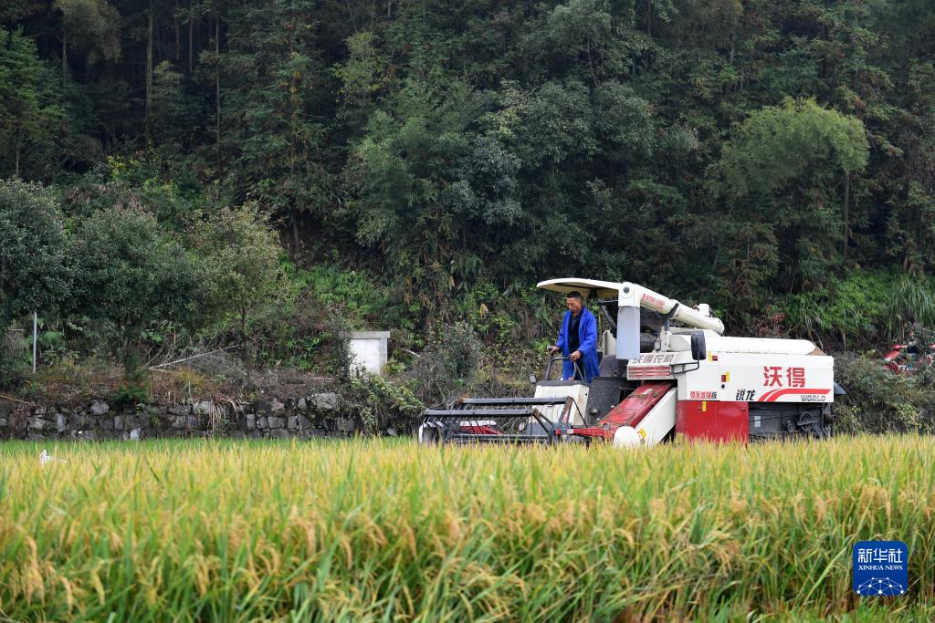 10月28日,在位于婁底市雙峰縣永豐街道松坪村的“稻再油”示范片,農機手駕駛收割機收割再生季稻谷。