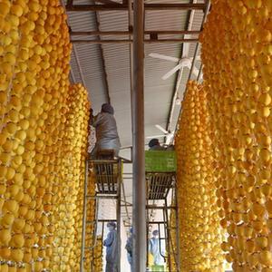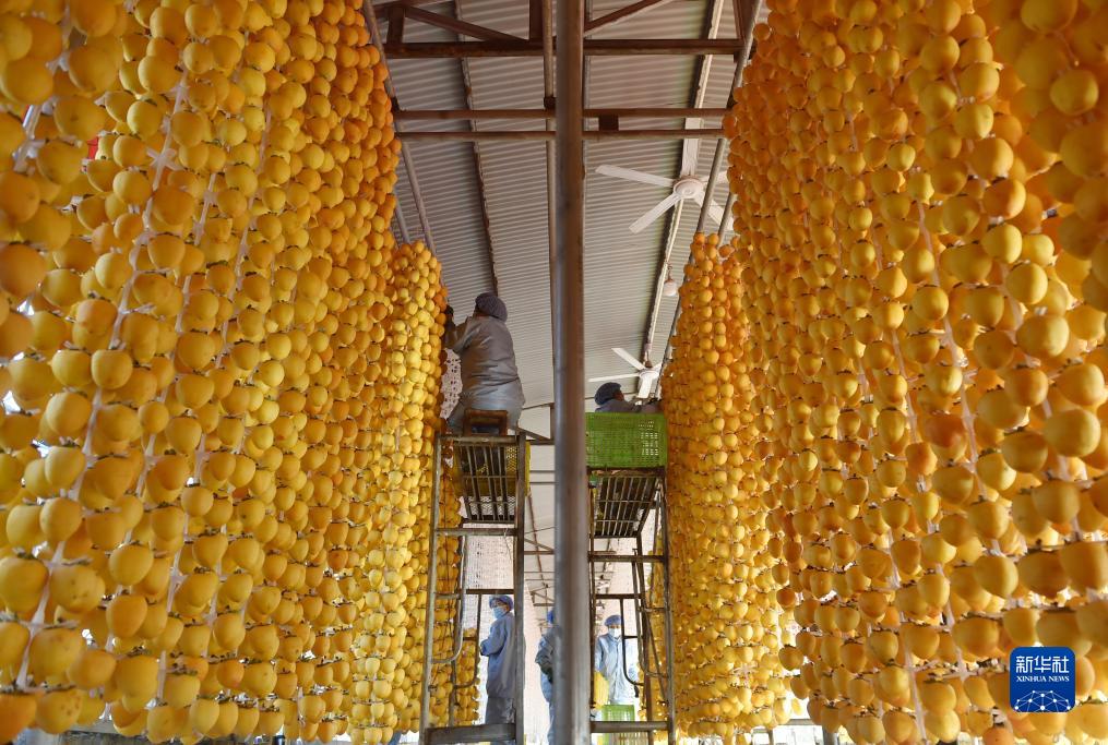 10月28日,村民在禹州市磨街鄉劉門(mén)村的加工廠(chǎng)里吊掛柿子,準備制作柿餅。