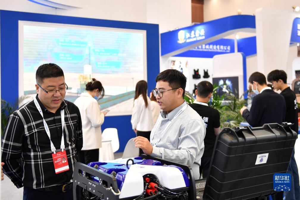 10月29日,在長(cháng)沙國際會(huì )議中心,參展商(右)向觀(guān)眾介紹特種裝備。