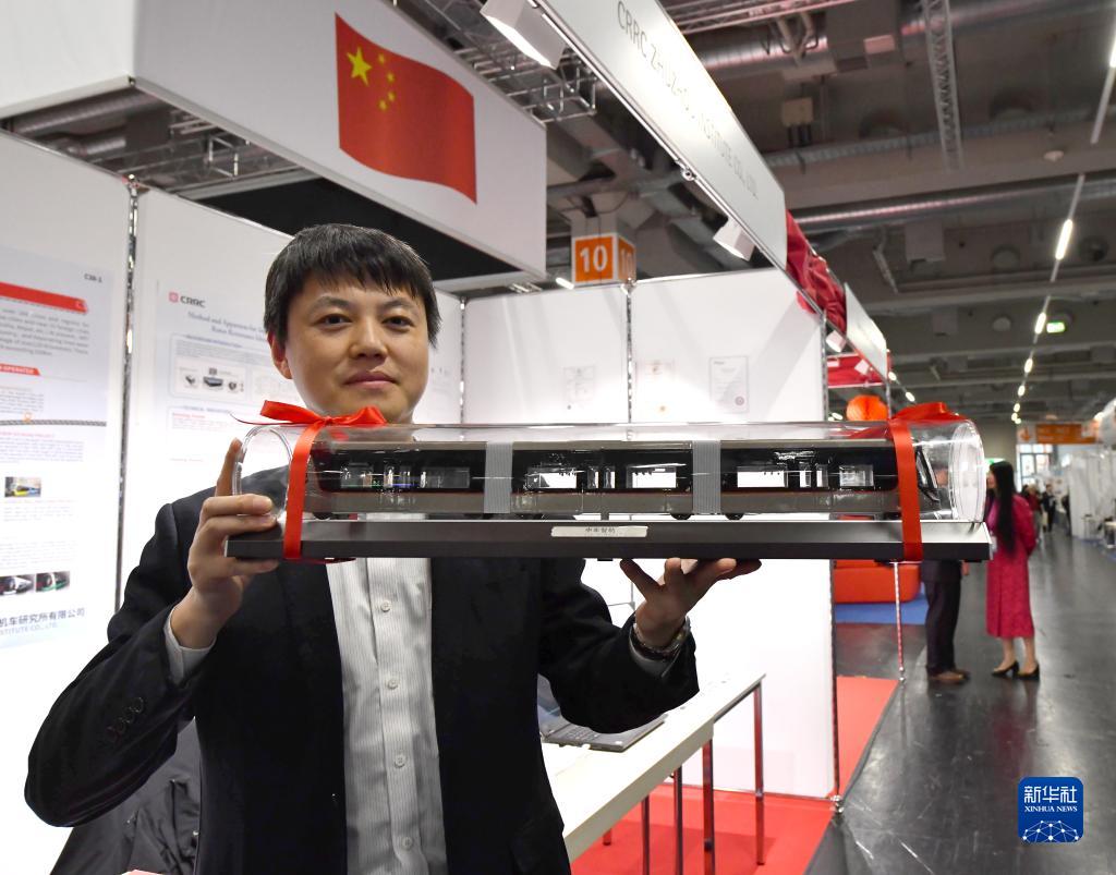 10月28日,在德國紐倫堡,中車(chē)株洲電力機車(chē)研究所有限公司工作人員展示一款智能軌道快運列車(chē)模型。智能軌道快運系統無(wú)需鋪設物理軌道,地面畫(huà)有白色虛擬軌道,車(chē)輛借助軌跡跟隨等技術(shù)行駛。
