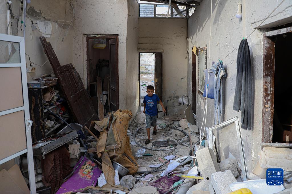 10月29日,在加沙地帶南部城市汗尤尼斯,一名兒童走在遭以色列襲擊損毀的建筑中。