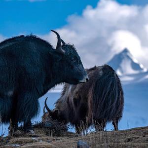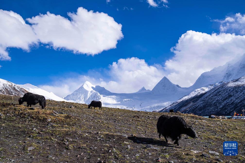 牦牛在薩普雪山腳下的草場(chǎng)上吃草(10月28日攝)。