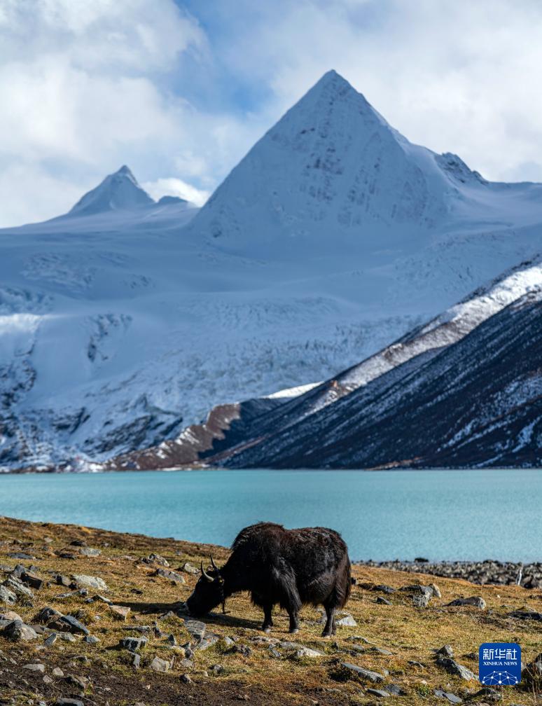 一頭牦牛在薩普雪山腳下的草場(chǎng)上吃草(10月28日攝)。