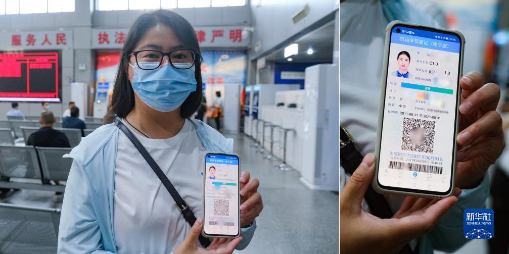 2021年6月1日,在四川省成都市公安局交通管理局車(chē)輛管理所綜合服務(wù)大廳,一名市民展示她剛用手機APP領(lǐng)取的電子駕駛證。