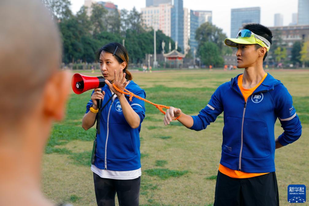 在四川大學(xué)華西校區運動(dòng)場(chǎng),“黑暗跑團”志愿者陳霞(左)和張志宏向新加入的陪跑志愿者展示如何使用陪跑繩(10月28日攝)。新華社記者 沈伯韓 攝