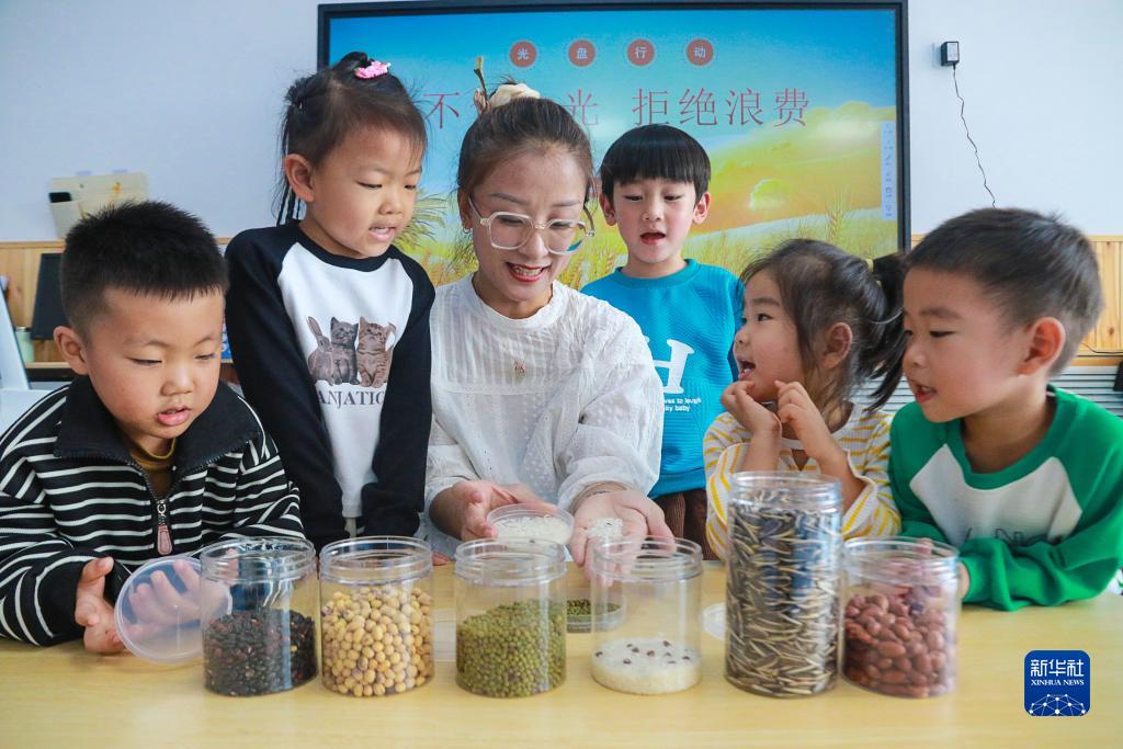 10月31日,在山東省高密市鳳鳴實(shí)驗幼兒園,孩子們在老師指導下認識糧食。