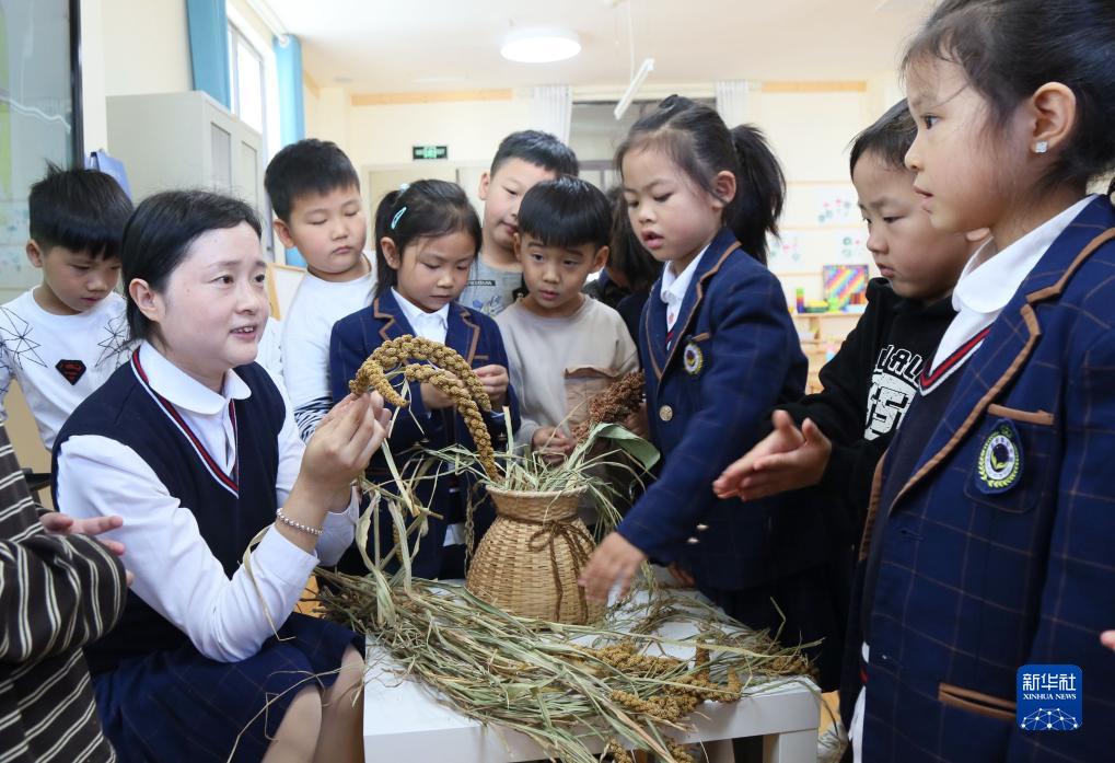 10月31日,河南省洛陽(yáng)市汝陽(yáng)縣新華園幼兒園老師教小朋友們識別谷子,提醒大家珍惜糧食。
