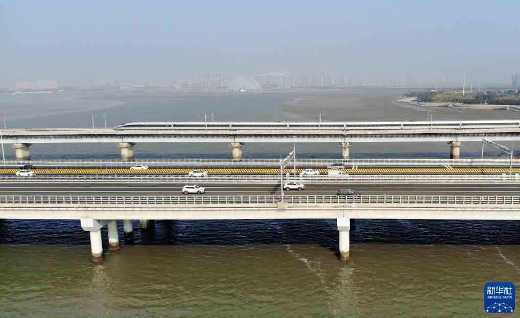車(chē)輛從青蘭高速女姑口跨海特大橋(前)上駛過(guò)(10月31日攝,無(wú)人機照片)。
