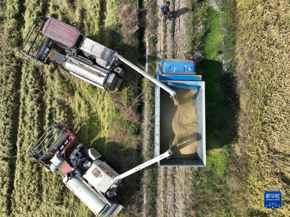 10月30日,江蘇省揚州市邗江區槐泗鎮,農民將收獲的水稻裝車(chē)(無(wú)人機照片)。