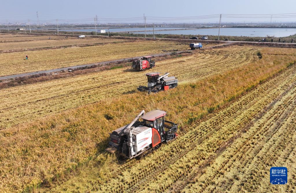 10月30日,收割機在江蘇省連云港市大新農場(chǎng)收割耐鹽堿水稻(無(wú)人機照片)。