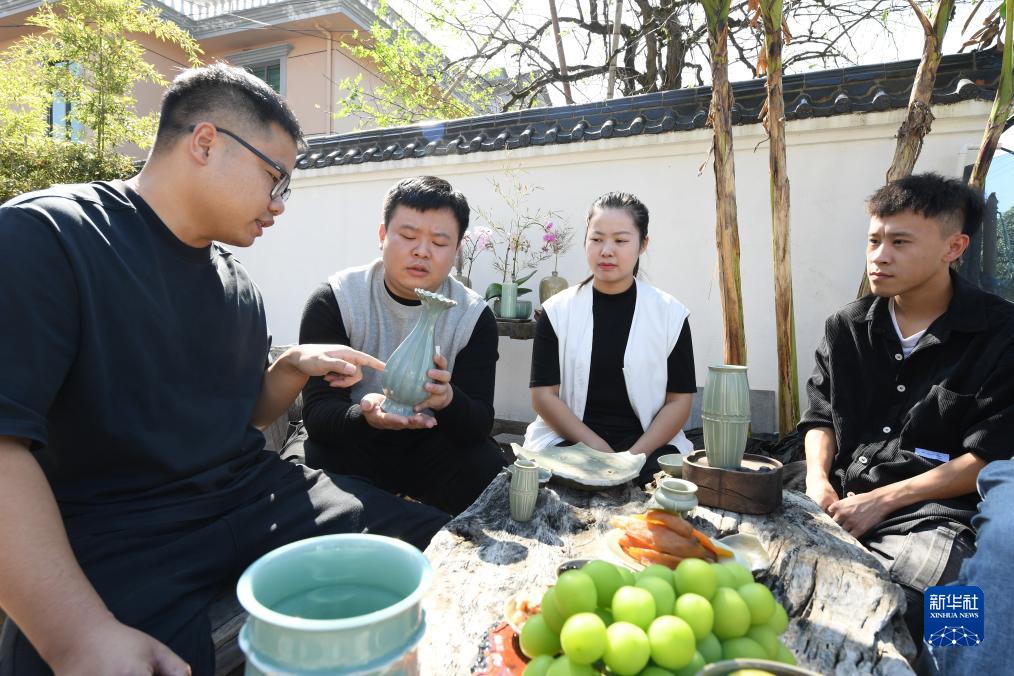 10月31日,季雙?。ㄗ蠖┖图举Y美(右二)在“梅夫人”工作室的小院跟來(lái)訪(fǎng)的陶藝家季冬(左一)、楊濤討論新作。