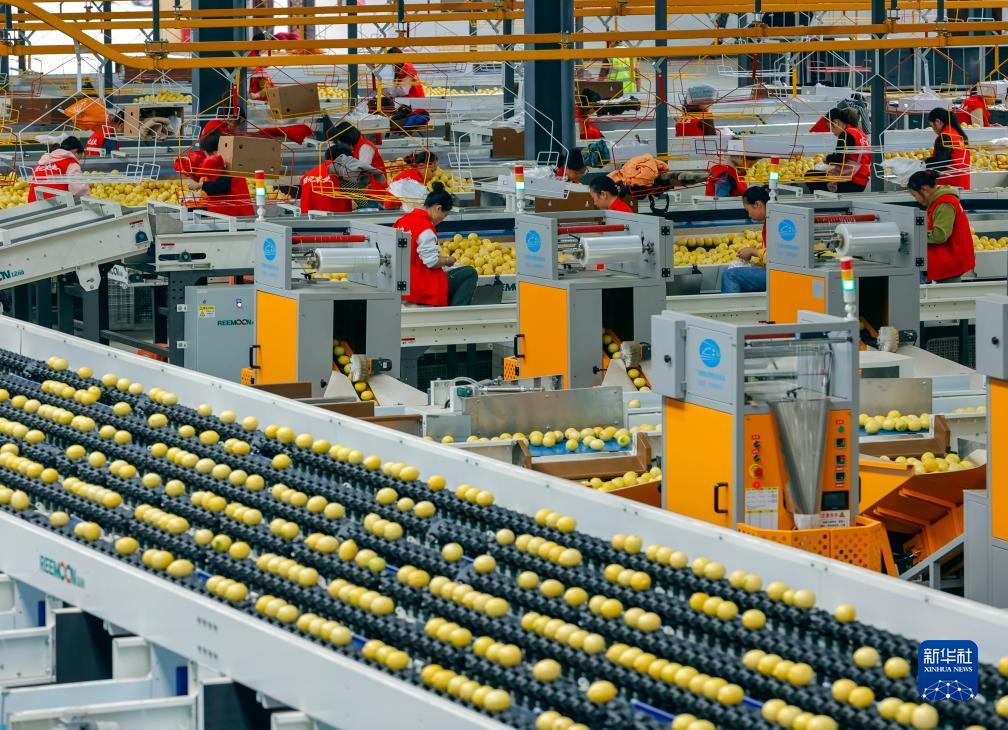 10月31日,在位于四川資陽(yáng)市安岳縣的四川省維記農業(yè)集團有限公司,工人在生產(chǎn)線(xiàn)上處理初步挑選好的新鮮檸檬。
