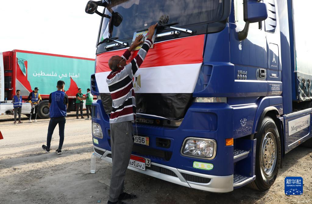 這是10月31日在拉法口岸埃及一側拍攝的載有救援物資的卡車(chē)。
