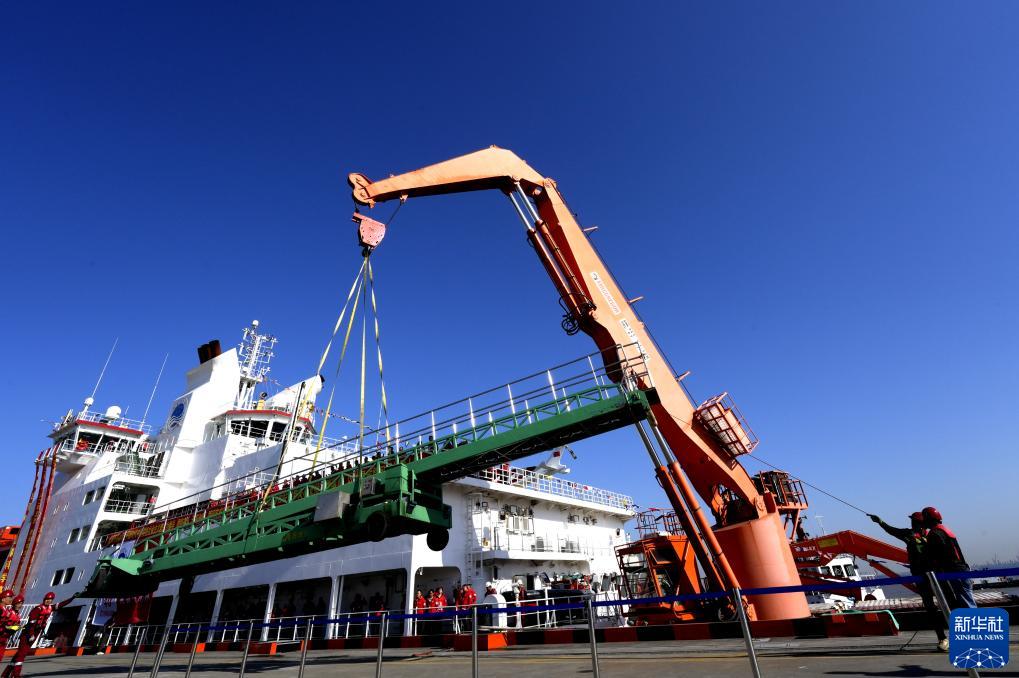 11月1日,在中國極地考察國內基地碼頭,工作人員吊運“雪龍2”號舷梯,準備起航。