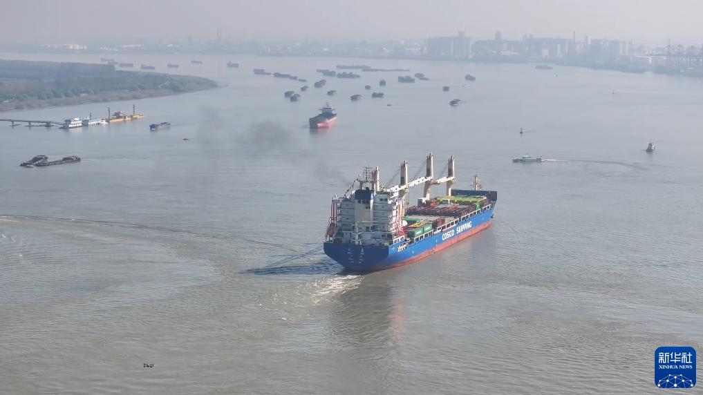 11月1日,“天惠”輪貨船駛離張家港港(無(wú)人機照片)。