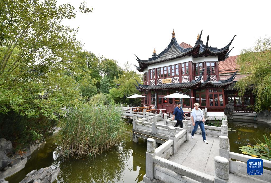 9月28日,人們行走在德國漢堡豫園九曲橋上。