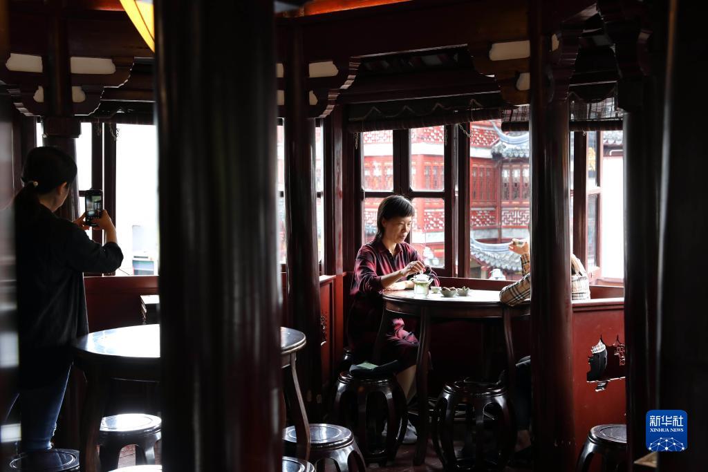 10月12日,人們在上海豫園九曲橋湖心亭茶樓喝茶。湖心亭茶樓是上?,F存最古老的茶樓。