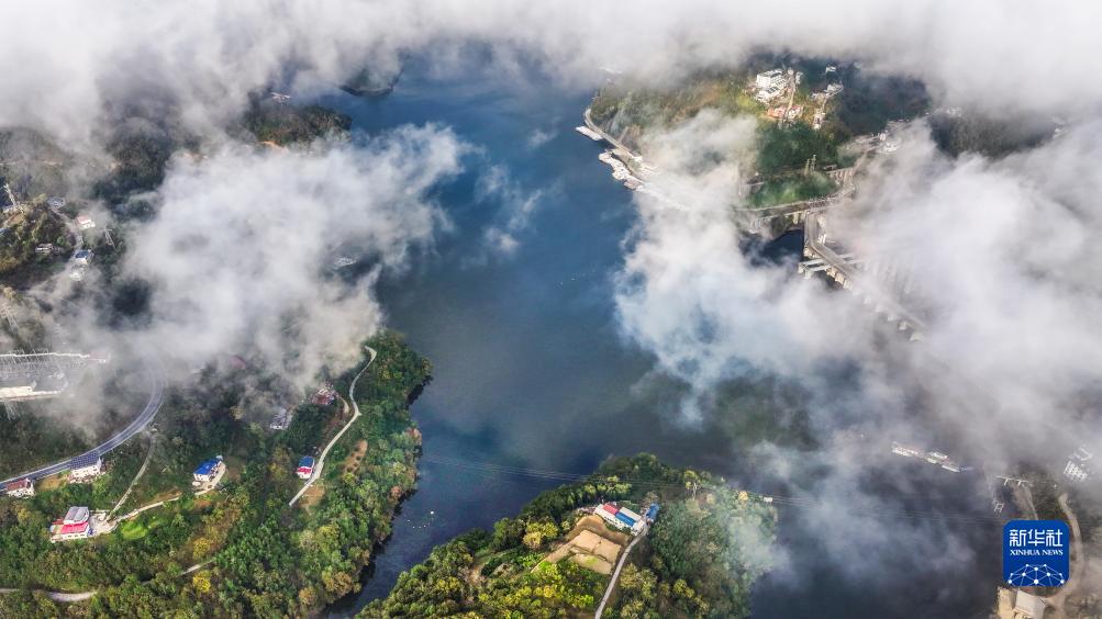 11月1日拍攝的陜西安康瀛湖景區秋景(無(wú)人機照片)。