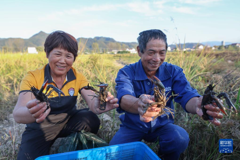 11月1日,建德市大洋鎮三河村的澳洲淡水龍蝦養殖戶(hù)展示剛剛捕撈的龍蝦。