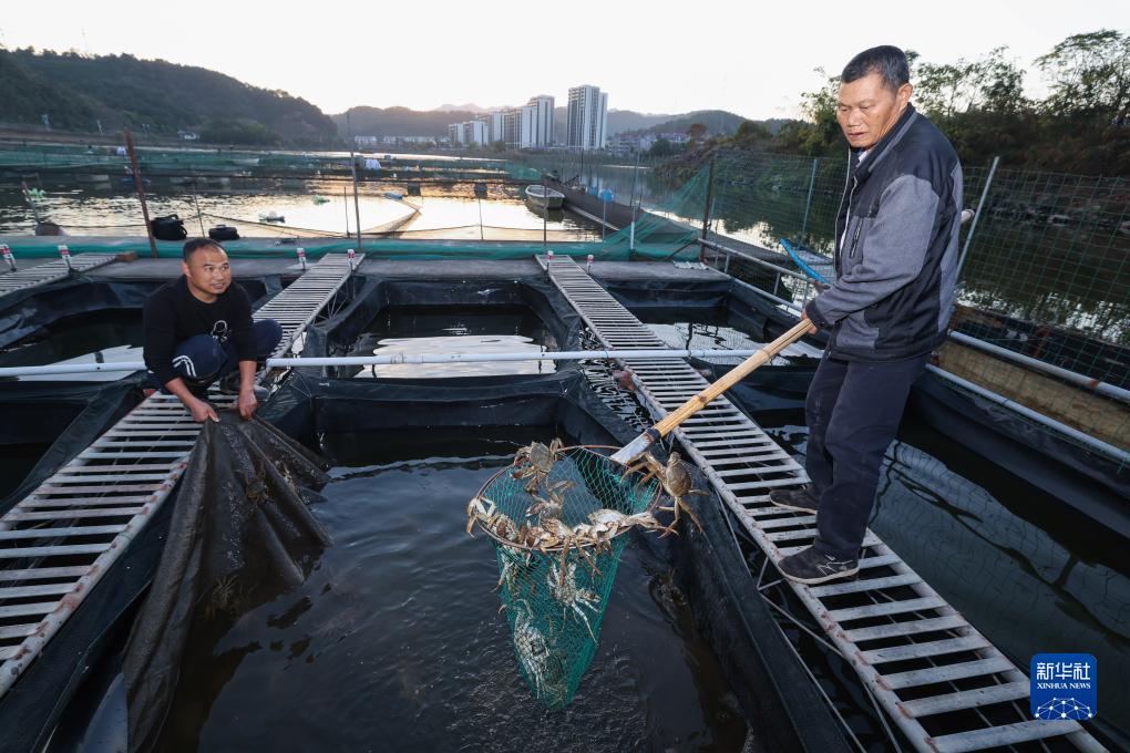 11月1日,建德市大洋鎮的大洋螃蟹養殖戶(hù)在養殖水域捕撈螃蟹。
