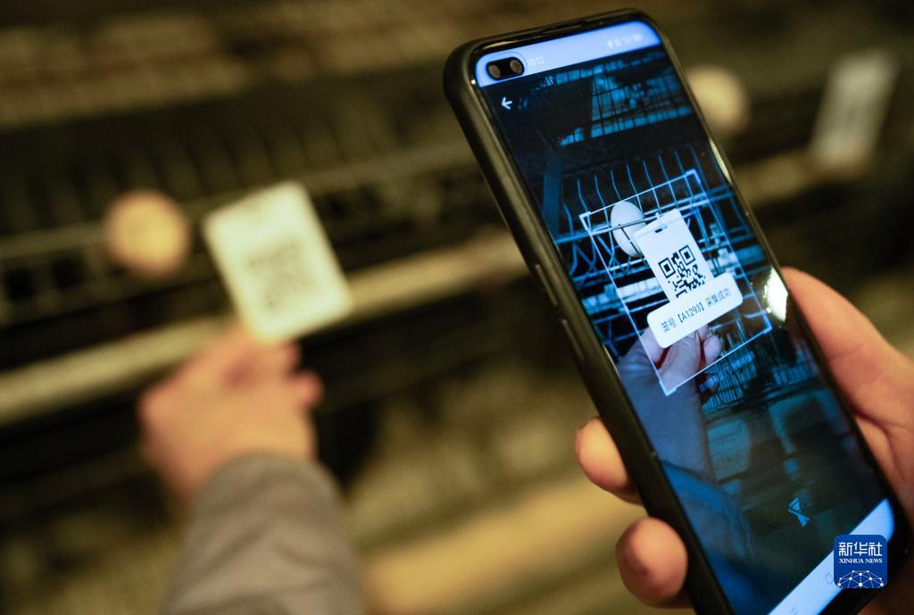 11月1日,一名工作人員在鹽津縣一家種雞場(chǎng)掃碼記錄種雞下蛋情況。