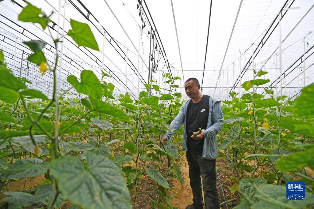 11月2日,在天津市西青區辛口鎮當城村,農戶(hù)在大棚內查看黃瓜的生長(cháng)情況。