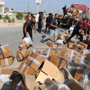 11月2日,在加沙地帶南部,人們從卡車(chē)上卸下人道救援物資。
