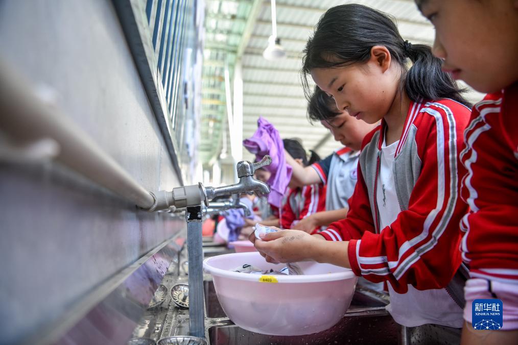 11月2日,在黃梅向日葵研學(xué)實(shí)踐教育營(yíng)地,學(xué)生們在洗衣服。
