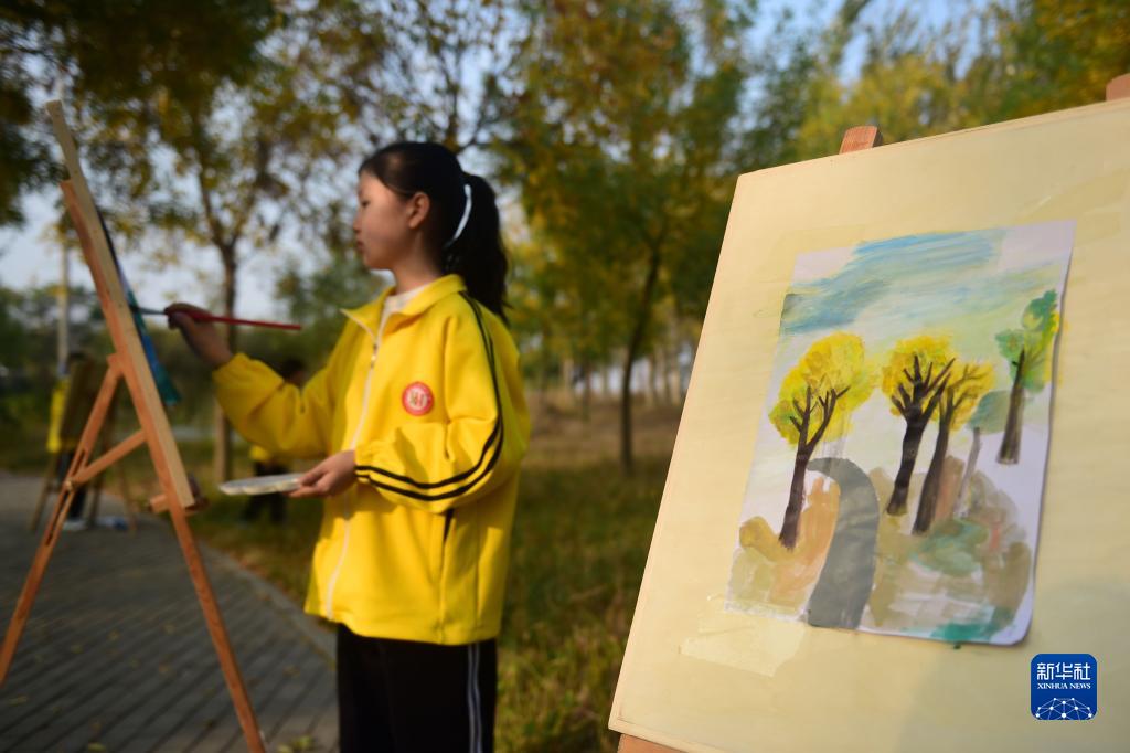 11月3日,鹽山縣新華小學(xué)的學(xué)生在戶(hù)外繪畫(huà)。