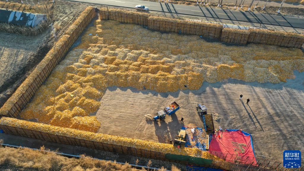 10月30日,在吉林省德惠市達家溝鎮杏山村大春家庭農場(chǎng),農民將收獲的玉米裝進(jìn)科學(xué)儲糧倉(無(wú)人機照片)。