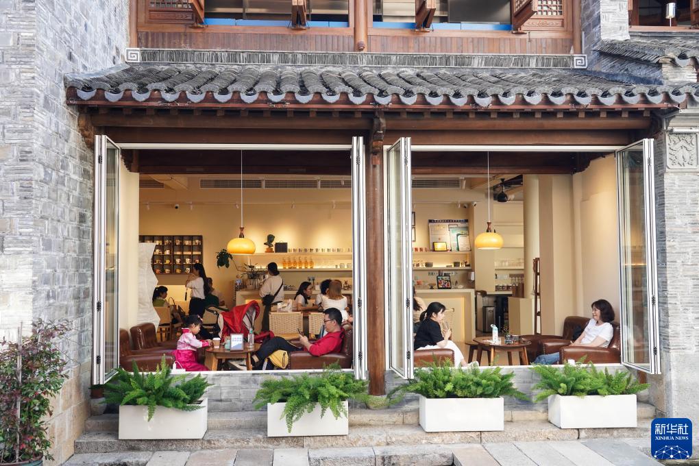 人們在棲霞古鎮一家咖啡店休閑(11月2日攝)。