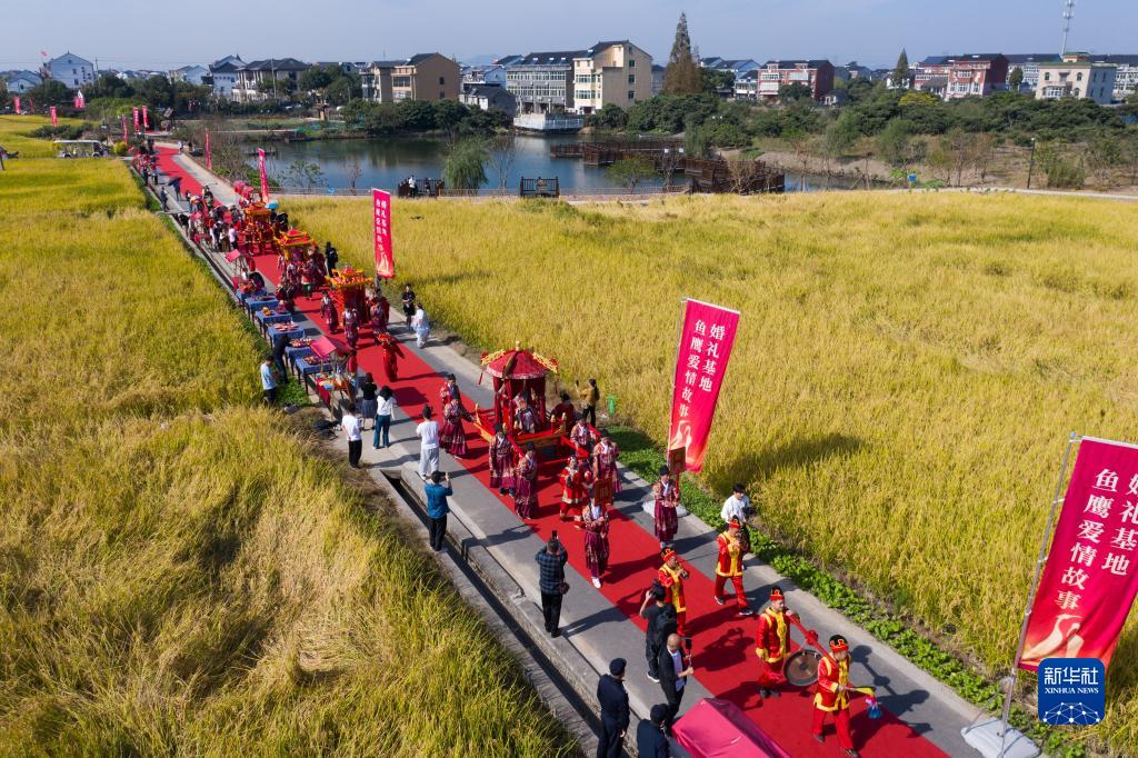 坐上大花轎、走過(guò)合歡橋、跨過(guò)紅火缸、同乘幸福船……11月3日,一場(chǎng)“良緣水鄉締 佳偶自天成”水鄉集體婚禮在浙江省杭州市臨平區塘棲鎮丁河村新建成的“丁山湖魚(yú)鷹愛(ài)情故事婚禮基地”舉行。八對新人在村民和游客的見(jiàn)證下喜結良緣,并發(fā)出《婚俗改革倡議書(shū)》,向廣大適婚青年傳播新時(shí)代的婚戀觀(guān),倡導健康文明的嫁娶新風(fēng)尚。該婚禮基地依托水鄉風(fēng)貌,已成為當地特色鄉村文旅品牌。