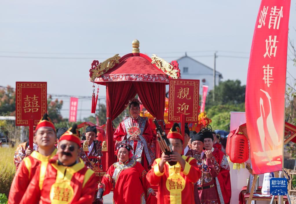 坐上大花轎、走過(guò)合歡橋、跨過(guò)紅火缸、同乘幸福船……11月3日,一場(chǎng)“良緣水鄉締 佳偶自天成”水鄉集體婚禮在浙江省杭州市臨平區塘棲鎮丁河村新建成的“丁山湖魚(yú)鷹愛(ài)情故事婚禮基地”舉行。八對新人在村民和游客的見(jiàn)證下喜結良緣,并發(fā)出《婚俗改革倡議書(shū)》,向廣大適婚青年傳播新時(shí)代的婚戀觀(guān),倡導健康文明的嫁娶新風(fēng)尚。該婚禮基地依托水鄉風(fēng)貌,已成為當地特色鄉村文旅品牌。