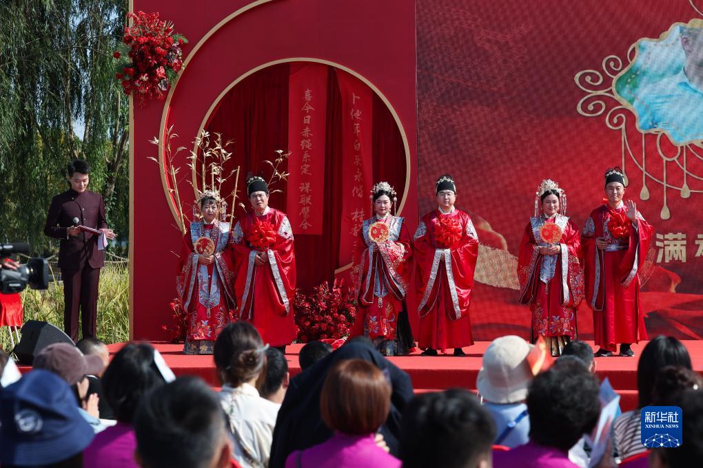 坐上大花轎、走過(guò)合歡橋、跨過(guò)紅火缸、同乘幸福船……11月3日,一場(chǎng)“良緣水鄉締 佳偶自天成”水鄉集體婚禮在浙江省杭州市臨平區塘棲鎮丁河村新建成的“丁山湖魚(yú)鷹愛(ài)情故事婚禮基地”舉行。八對新人在村民和游客的見(jiàn)證下喜結良緣,并發(fā)出《婚俗改革倡議書(shū)》,向廣大適婚青年傳播新時(shí)代的婚戀觀(guān),倡導健康文明的嫁娶新風(fēng)尚。該婚禮基地依托水鄉風(fēng)貌,已成為當地特色鄉村文旅品牌。