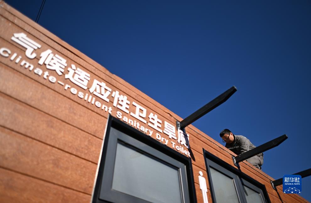 在青海省海東市平安區三合鎮幸福家園社區,一名施工人員在社區內安裝環(huán)保廁所(11月1日攝)。