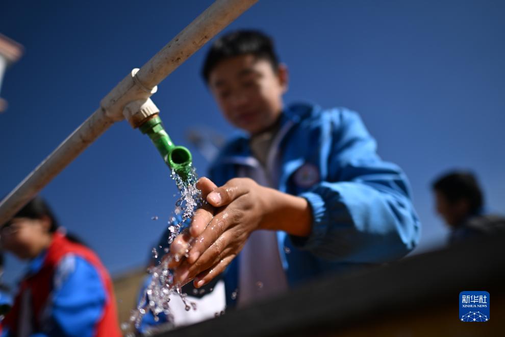 在青海省海東市互助土族自治縣臺子鄉中心學(xué)校,一名學(xué)生在使用廁所后洗手,臺子鄉中心學(xué)校是環(huán)境衛生特別項目學(xué)校之一(11月1日攝)。