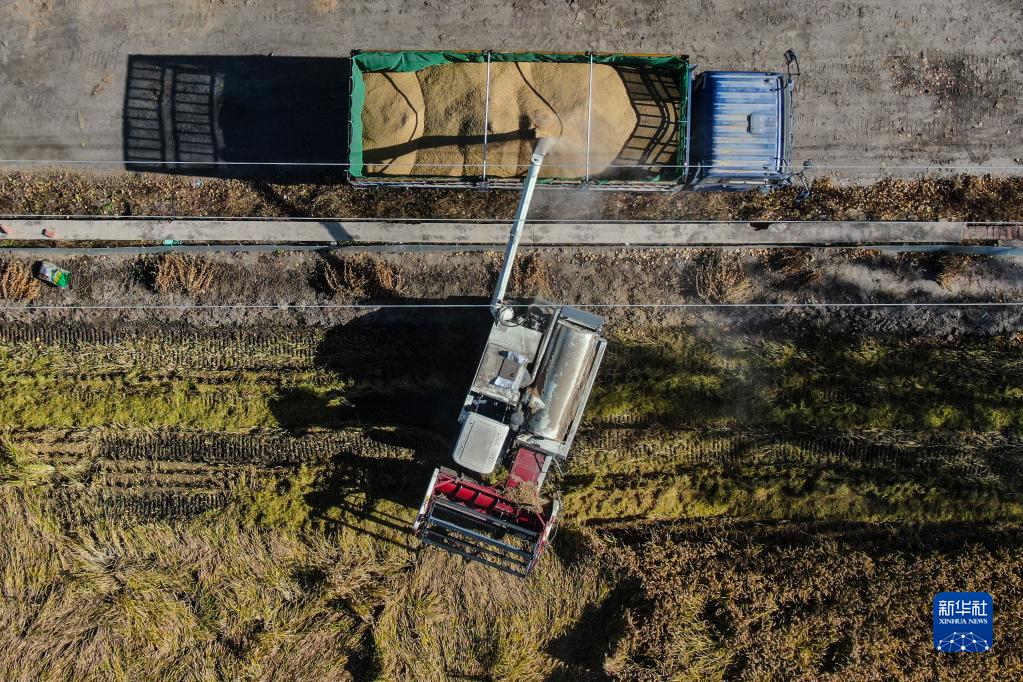 11月3日,農戶(hù)在盤(pán)錦市大洼區王家街道興海村將收割的水稻裝車(chē)(無(wú)人機照片)。