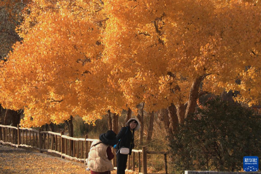 11月1日,游客在甘肅省敦煌市陽(yáng)關(guān)景區的胡楊樹(shù)下拍照。