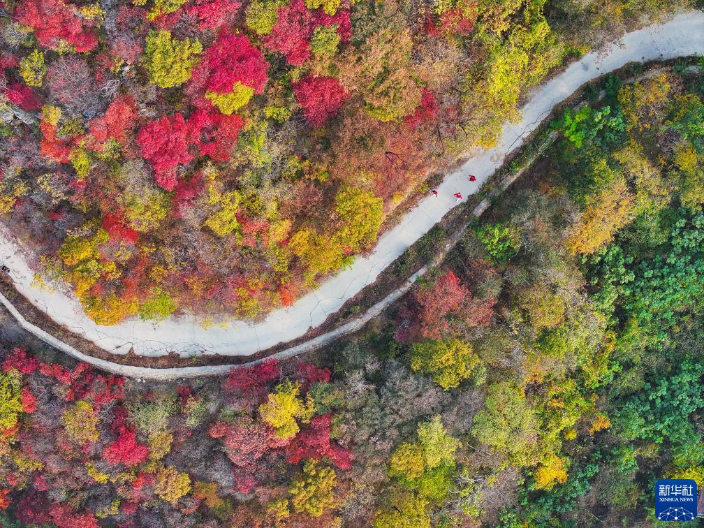 10月29日,游客在山東省淄博市博山區紅葉柿巖景區游覽(無(wú)人機照片)。
