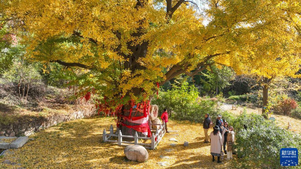 11月3日,游客在河北省遵化市侯家寨鎮禪林寺古銀杏樹(shù)風(fēng)景區游玩(無(wú)人機照片)。