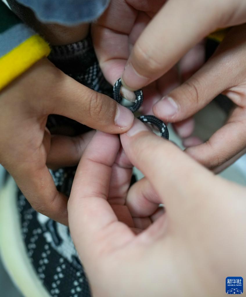 10月30日,在重慶市特殊教育中心的教室內,一名老師指導二年級視力障礙學(xué)生練習系鞋帶。