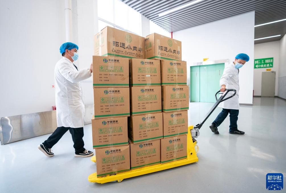 11月3日,工作人員在昭通市昭陽(yáng)區中新慧農供應鏈小肉串中央工廠(chǎng)搬運小肉串。