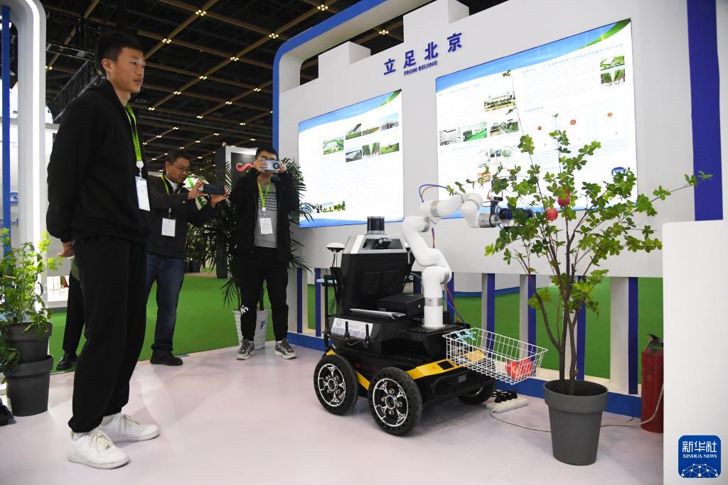 這是11月2日在世界農業(yè)科技博覽會(huì )現場(chǎng)拍攝的一款智能采摘機器人。